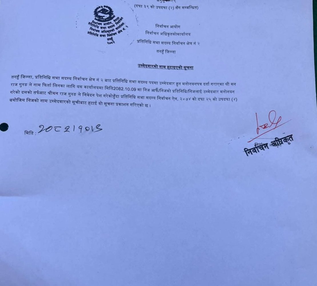 भिमाद । आगामी फागुन २१ गते हुने प्रतिनिधि सभा सदस्यको निर्वाचनमा तनहुँ २ मा राष्ट्रिय स्वतन्त्र पार्टीका उम्मेद्वारलाई सघाउने गरि उज्यालो नेपाल पार्टीका उम्मेदवार मनराज गुरुङले उम्मेदवारी फिर्ता लिएका छन् । गुरुङले रास्वपाको जित सुनिश्चित गर्न उम्मेदवारी फिर्ता लिएर सघाउने निर्णयमा पुगेको प्रतिक्रिया दिए ।