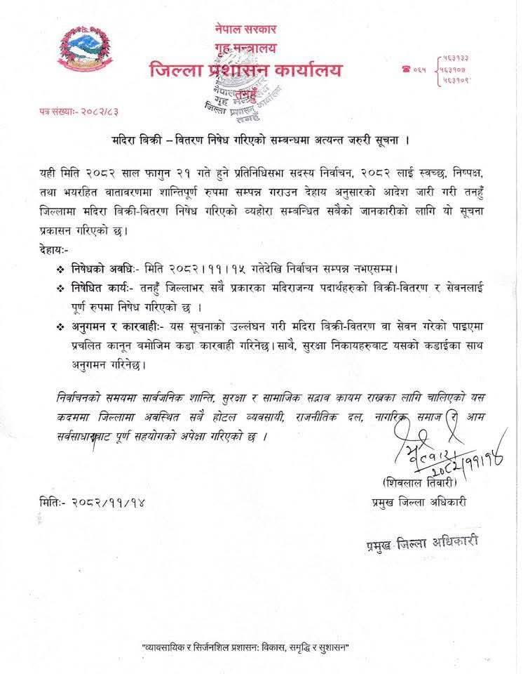 प्रशासनले बिहीबार सूचना जारी गर्दै फागुन १५ गतेदेखि निर्वाचन सम्पन्न नभएसम्मका लागि जिल्लाभर मदिराजन्य पदार्थको बिक्री–वितरण र सार्वजनिक स्थानमा सेवन गर्न निषेध गरेको जनाएको हो ।