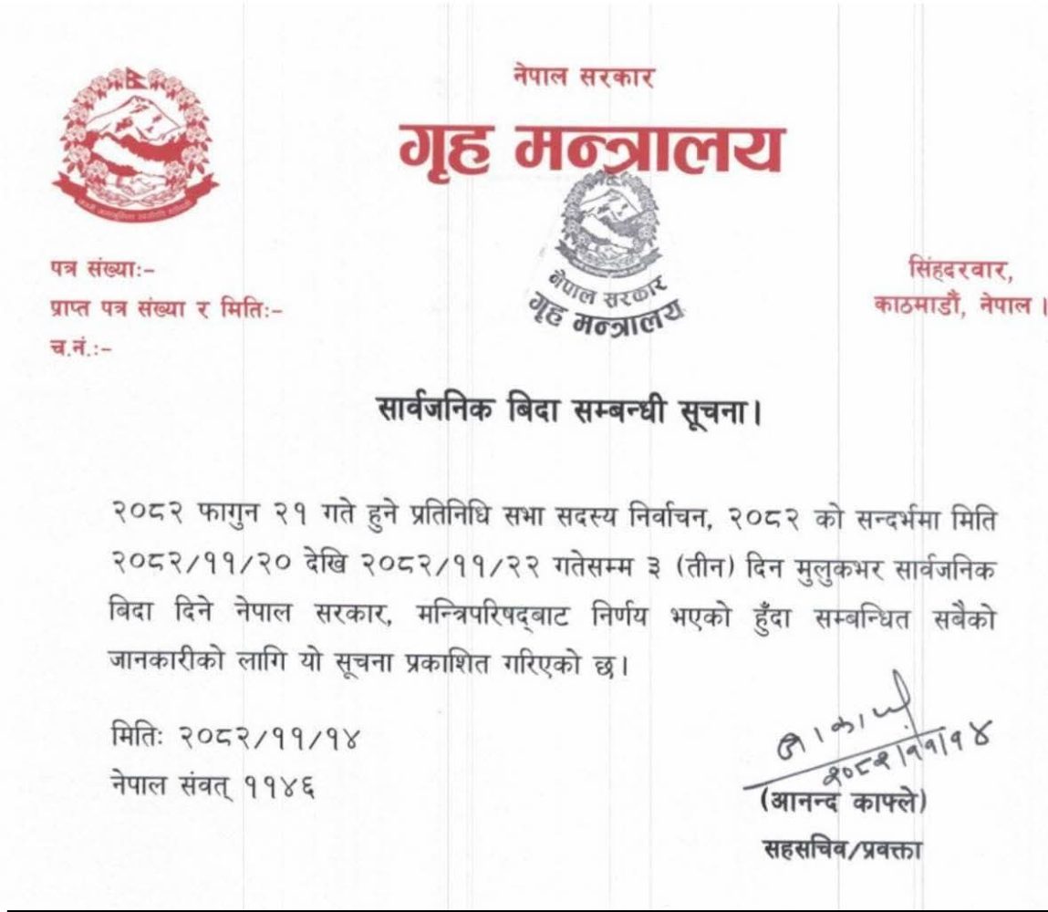 भिमाद । सरकारले फागुन २१ गतेको प्रतिनिधिसभा निर्वाचनलाई लक्षित गर्दै तीन दिन सार्वजनिक बिदा दिएको छ । मंगलबार बसेको मन्त्रिपरिषद्को बैठकले फागुन २०, २१ र २२ गतेलाई सार्वजनिक बिदा दिने निर्णय गरेको हो ।