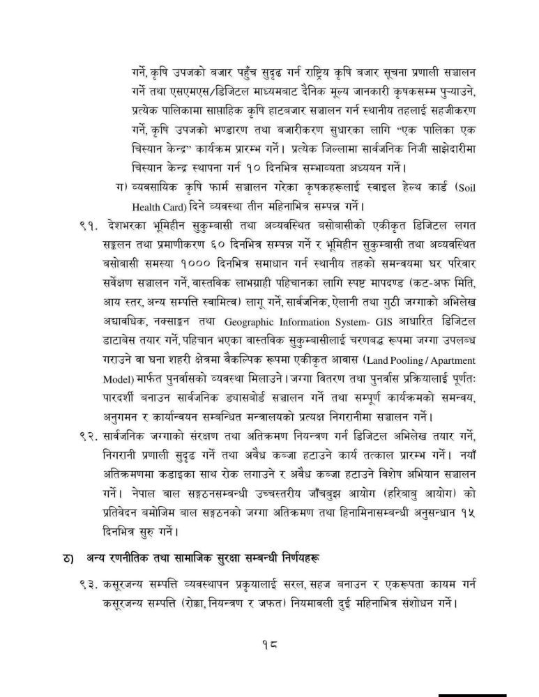 ६० दिनभित्र भूमिहीन, सुकुम्वासी तथा अव्यवस्थित बसोवासीको एकीकृत डिजिटल लगत संकलन गर्ने सरकारको कार्ययोजना छ । त्यस्तै १००० दिनभित्र समस्या समाधान गर्न स्थानीय तहको समन्वयमा घर परिवार सर्वेक्षण सञ्चालन गर्ने, वास्तविक लाभग्राही पहिचानका लागि स्पष्ट मापदण्ड लागू गर्नेजस्ता योजना सरकारले बनाएको छ ।